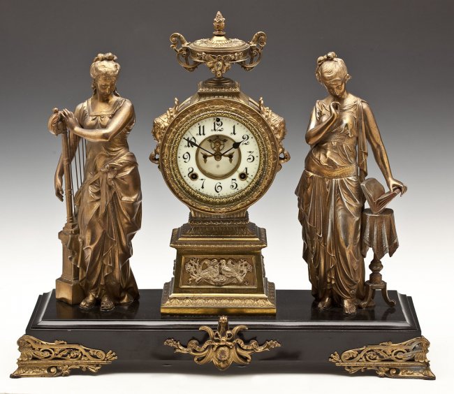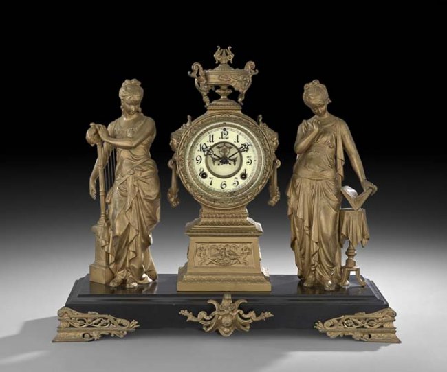 Ansonia Gilt-Metal “Music and Poetry” Figural Mantel Clock, fourth quarter 19th century, Brooklyn, New York, the enameled base holding allegorical figures of Music and Poetry flanking the clock, in a molded metal case mounted with ring handles terminating in masques, and an urn-form finial, signed on both the works and on the porcelain dial, which has an exposed escapement, h. 21-1/4″, w. 23-1/2″, d. 8″.