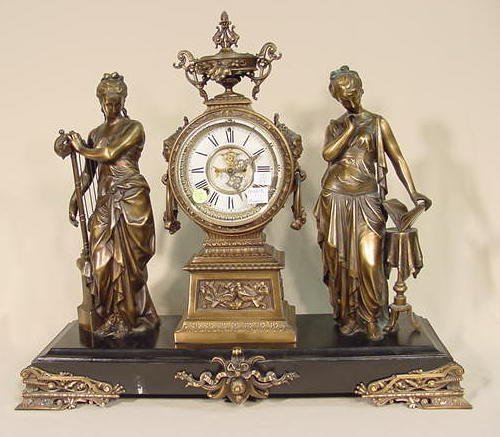 Ansonia Music & Poetry Statue Clock: 8 day time and strike with visible escapement and a good dial.