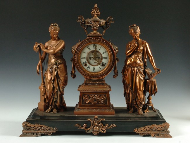 DESCRIPTION: Ansonia Clock Company Music and Poetry 8-day mantle clock. Circa 1894. Japanese bronze figures of two women (Music and Poetry) on either side of the central clock. Double sunk enamel dial with exposed escapement and Arabic numerals. On a black metal base. Marked “Manufactured by The Ansonia Clock Co. New York, United States of American” on the dial and with hallmark and “Ansonia Clock Co. Patented June 14, ’81, New York, U.S.A.,” on the movement. With two keys. Ly 483. MEASUREMENTS: 17-1/2″ x 23-1/2″ x 8″. CONDITION: Running. Chimes. Some wear to bronze figurines. Loss to central screw that attaches the top central finial to the base.