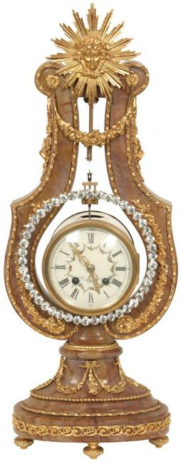 Alabaster Lyre Mantle Clock Estimate: Auctioneer: Sold Price: Sold Date: 20th Century lyre-form alabaster mantle clock with gilt mounts, gar...