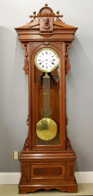 A late 19th century No. 8 floor model jeweler’s regulator by the William L. Gilbert Clock Co. Winsted, CT. 8-day weight driven time only movement with sweep seconds hand and pin-wheel escapement, compensating pendulum and a glass dial with Brass bezel. Mahogany case with pediment top and carved Sphinx Mask, over a single long door with carved dial surround on a squat base with paneled detail and molded bracket feet. Original “Cherry” finish with some wear, restored dial surround, running when cataloged. 105″ High overall.