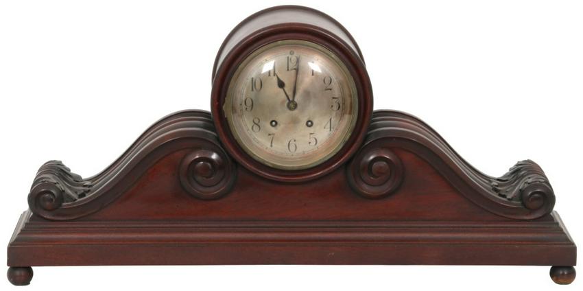 Large Mahogany Humpback Mantle Clock Estimate: Auctioneer: Sold Price: Sold Date: Large Mahogany Humpback Mantle Clock. The impressive scrol...