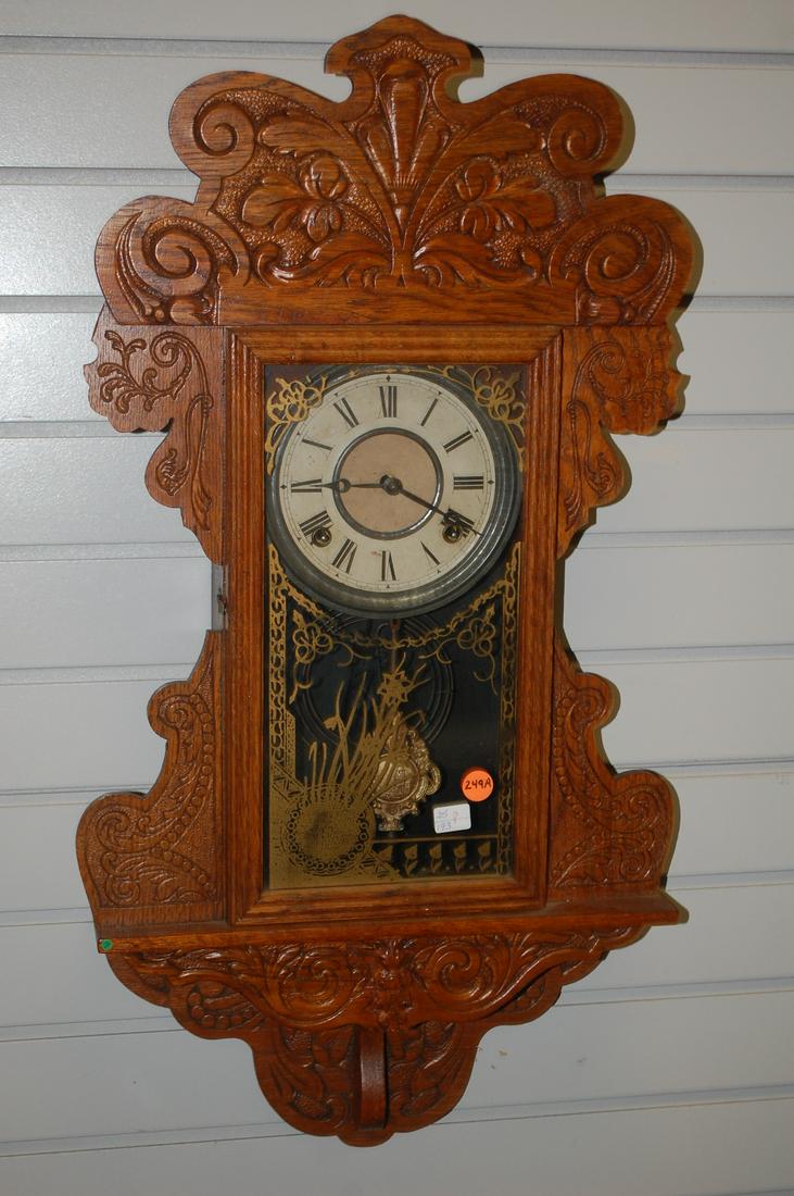 Antique Oak Carved Kitchen Clock Estimate: Auctioneer: Sold Price: Sold Date: Antique Oak Carved Kitchen Clock: new dial, brass T&S move...