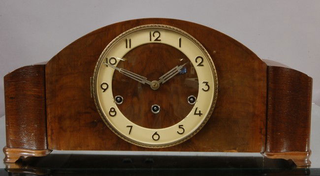 German Walnut Mantel Clock Estimate: Auctioneer: Sold Price: Sold Date: German mantel clock with a walnut case having an architectural domed...