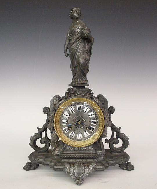 A late 19th century French Mantle clock by Japy Freres. 8-day time and strike movement with an engraved metal dial and porcelain Roman numerals with embossed Brass bezel. Cast White metal case with an Allegorical figure a woman holding a globe. Original finish with some wear, running when cataloged. 14 1/2″ high.
