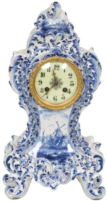 French Faience Delft Mantle Clock Estimate: Auctioneer: Sold Price: Sold Date: French mantle clock has a decorated blue & white Delft ca...