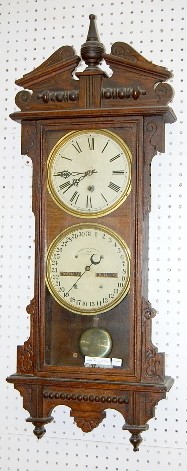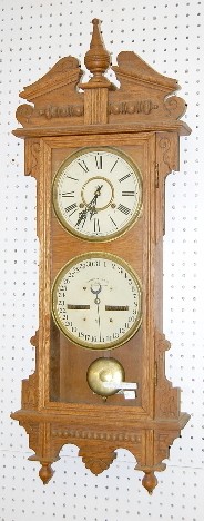 Oak Waterbury No. 33 Hanging Calendar Clock: nice carved case; 7 1/2″ dials, pretty nice.