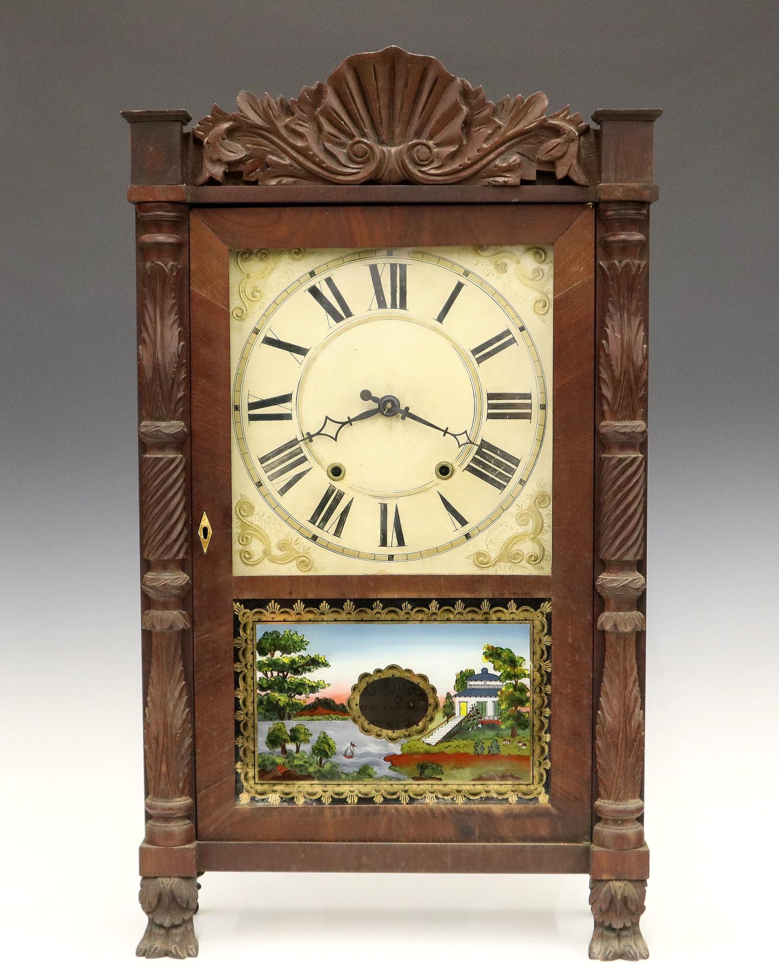 A mid 19th century Riley Whiting shelf clock. 30 hr time and strike wooden works movement with a painted wooden dial. Mahogany case with carved crest, single long door with a reverse painted lower panel flanked by carved pilasters on a base with carved paw feet. Older finish with minor damage, lacks finials, running momentarily when cataloged. 29 1/2" high. ESTIMATE $300-400