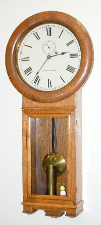 Seth Thomas Regulator No.2 Wall Clock: time only weight driven movement with a 12″ dial. In an oak case.