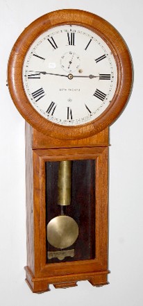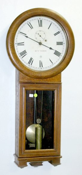 Seth Thomas Regulator No.2 Wall Clock: time only weight driven movement with a 12″ dial. In an oak case.