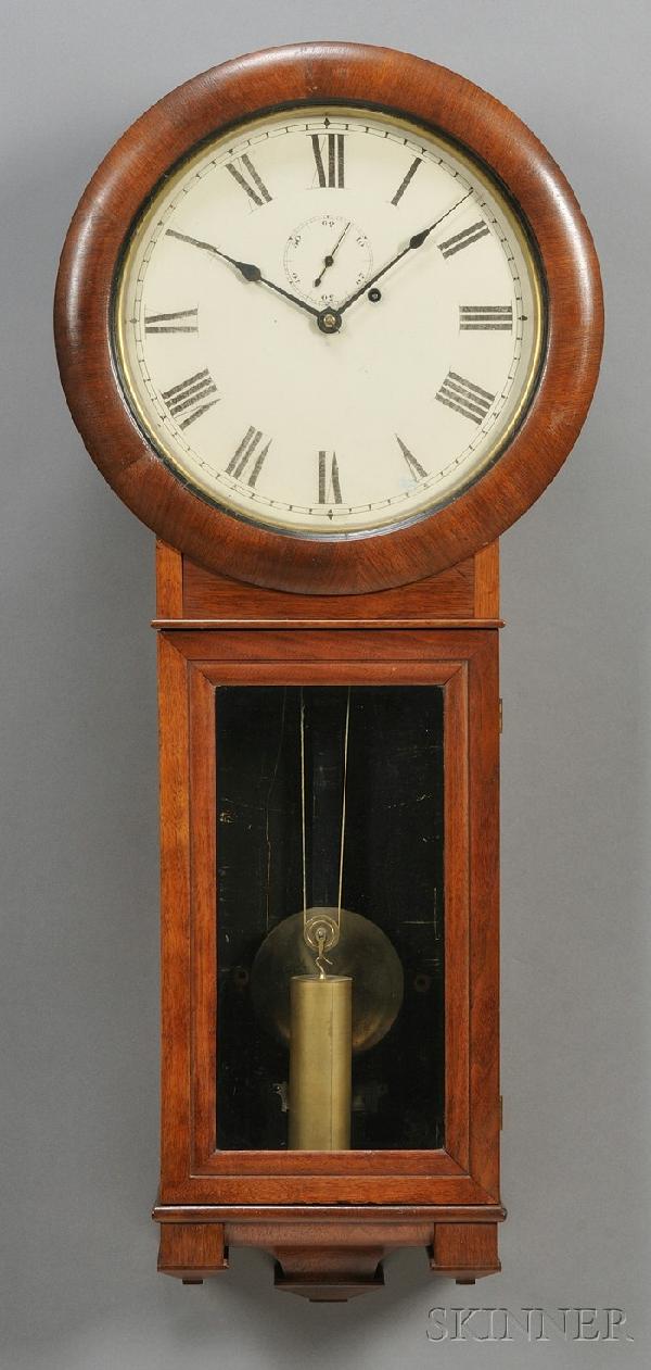 Mahogany Seth Thomas Regulator No. 2 Wall Clock, Thomaston, Connecticut, late 19th century, zinc dial with Roman numerals, seconds bit, eight-day time only movement with maintaining power, dead-beat escapement, pendulum and brass cased weight, ht. 36 in.