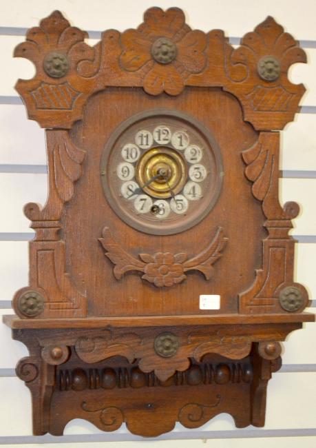 Antique Waterbury Oak Kitchen Clock Estimate: Auctioneer: Sold Price: Sold Date: Antique Waterbury Oak Kitchen Clock: good dial, signed T&am...