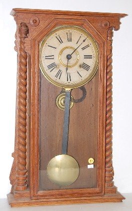 Ansonia Queen Ann Wall Clock: 8 day time with half hour gong strike and an 8″ dial. In an oak case.