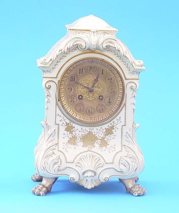 Japy Freres French Brass Mantel Clock: The dial has porcelain, Roman numeral cartouche numbers; the works are marked Japy Freres, 2554 7 4; in an ornate brass case decorated with acanthus leaves, urns and fancy hands; with the pendulum.