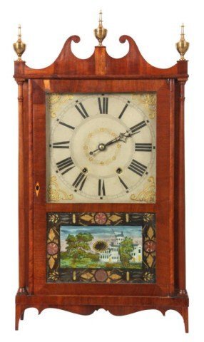 Hopkins & Alfred Pillar & Scroll Clock. Painted wood dial has a 10 in. chapter ring with black Roman hour numerals with gilt center embellishments and spandrels, blued pierced diamond hands; wooden works movement has count wheel strike mechanism on an iron bell, brass covered pendulum bob. In a mahogany case with broken arch crest, gilt brass finials, long turned columns and valenced apron; reverse painted tablet is broken and reinforced in the back. Paper label for Hopkins & Alfred, Harwinton Conn. Refinished, has a small piece of veneer missing from the door. 31 in. high x 17 in. wide x 4.5 in. deep.