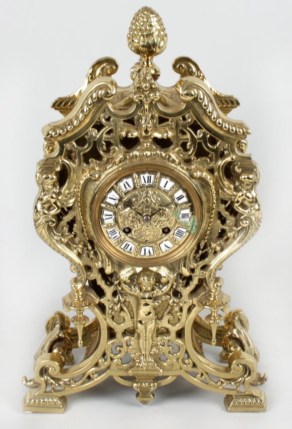 Antique French Brass Open Work Mantel Clock Estimate: Auctioneer: Sold Price: Sold Date: Antique French Brass Open Work Mantel Clock: With a...
